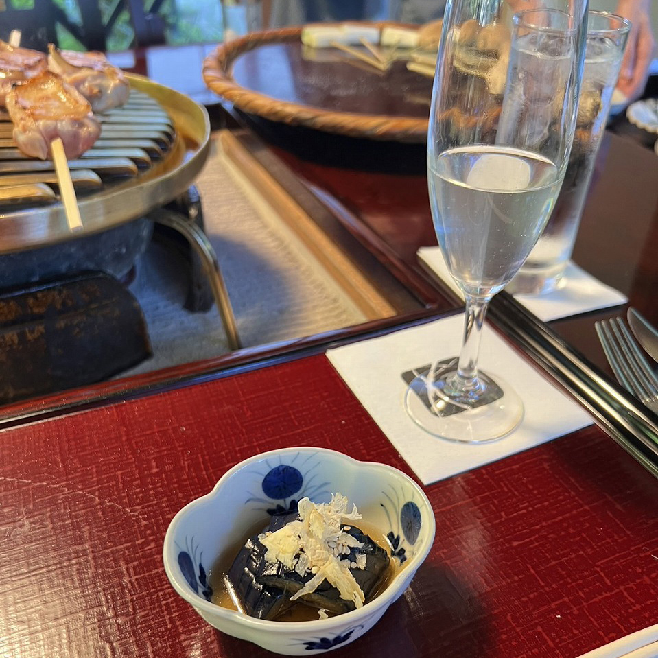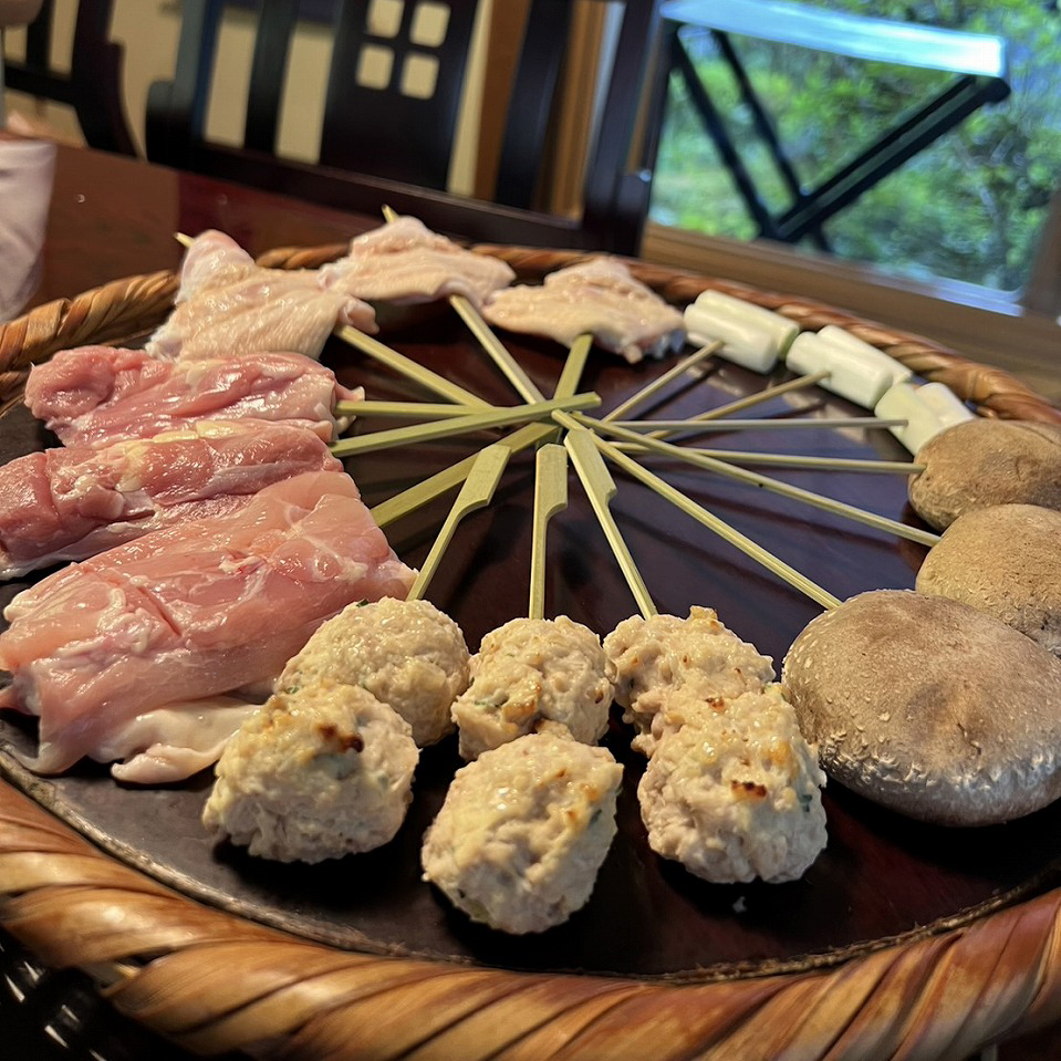 ここは、都会を離れた高尾山の麓 個室でいろり炭火焼料理をお楽しみください。 季節を楽しむ料理と名物の串焼き料理をいただきました。
