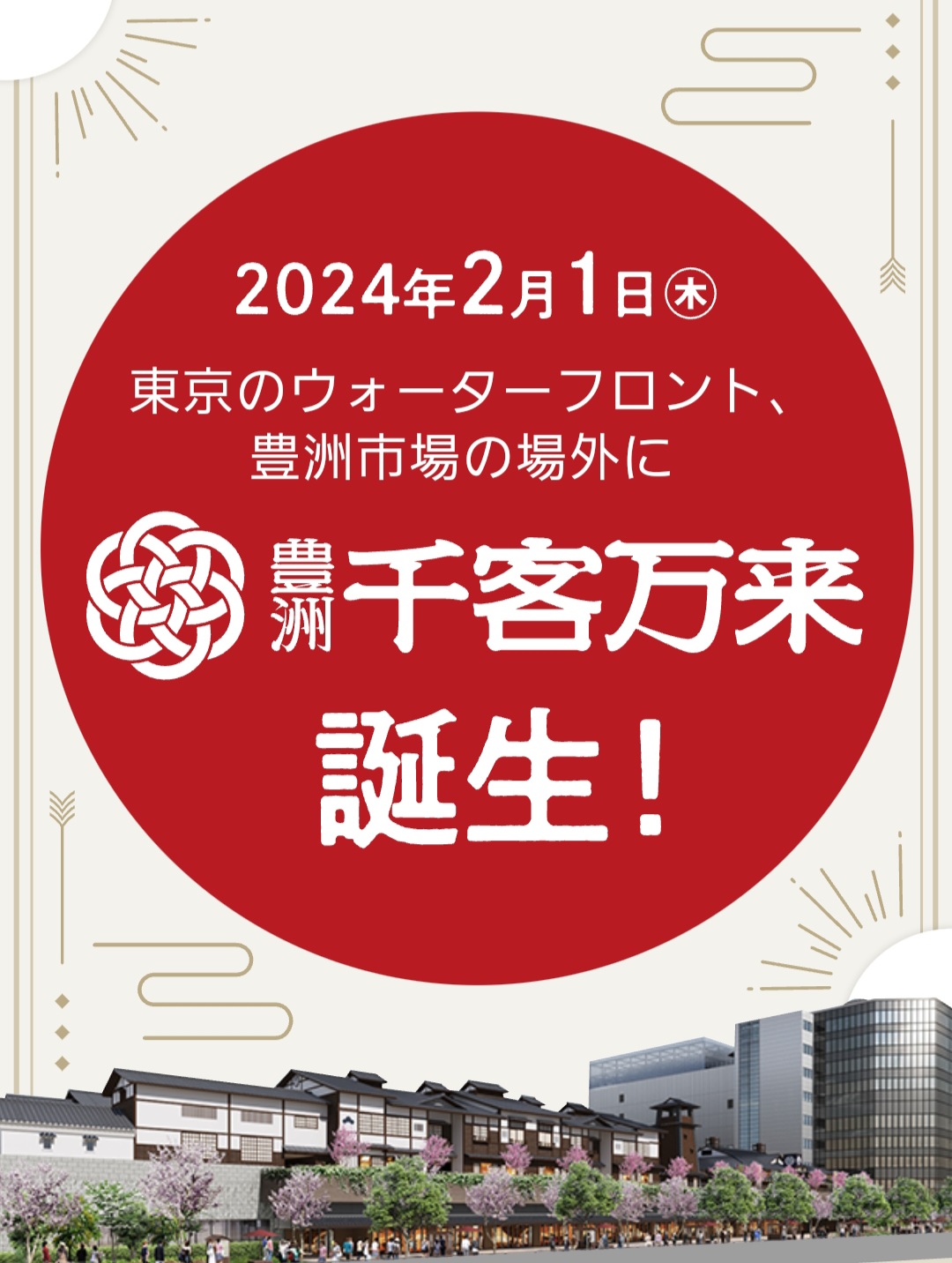 『千客万来』 多数の客が入れかわり立ちかわり 来て、絶え間がないこと・・・「豊洲 千客万来」は、築地特有の貴重な 財産である賑わいを継承・発展させるとと もに、豊洲市場本体施設と連携し、豊洲な らではの活気や賑わいを⽣み出すことで、 豊洲市場の魅⼒を⾼めつつ、地域のまちづ くりや活性化に貢献することを⽬的としています。 なんと、「豊洲 千客万来」のアンバサダーに、中村獅童さんが就任。