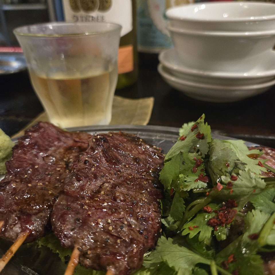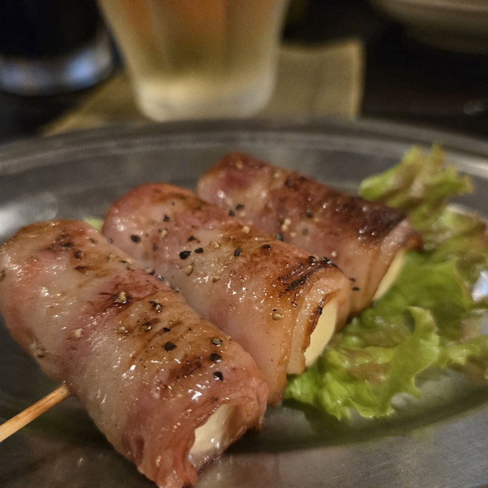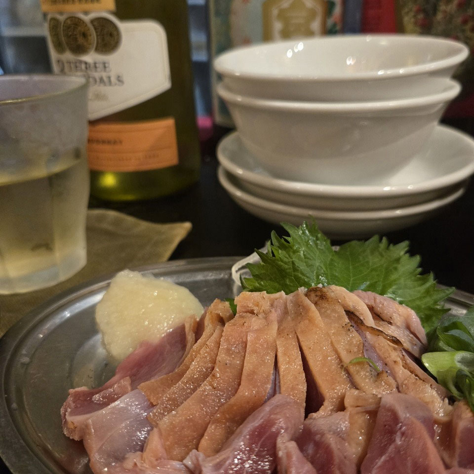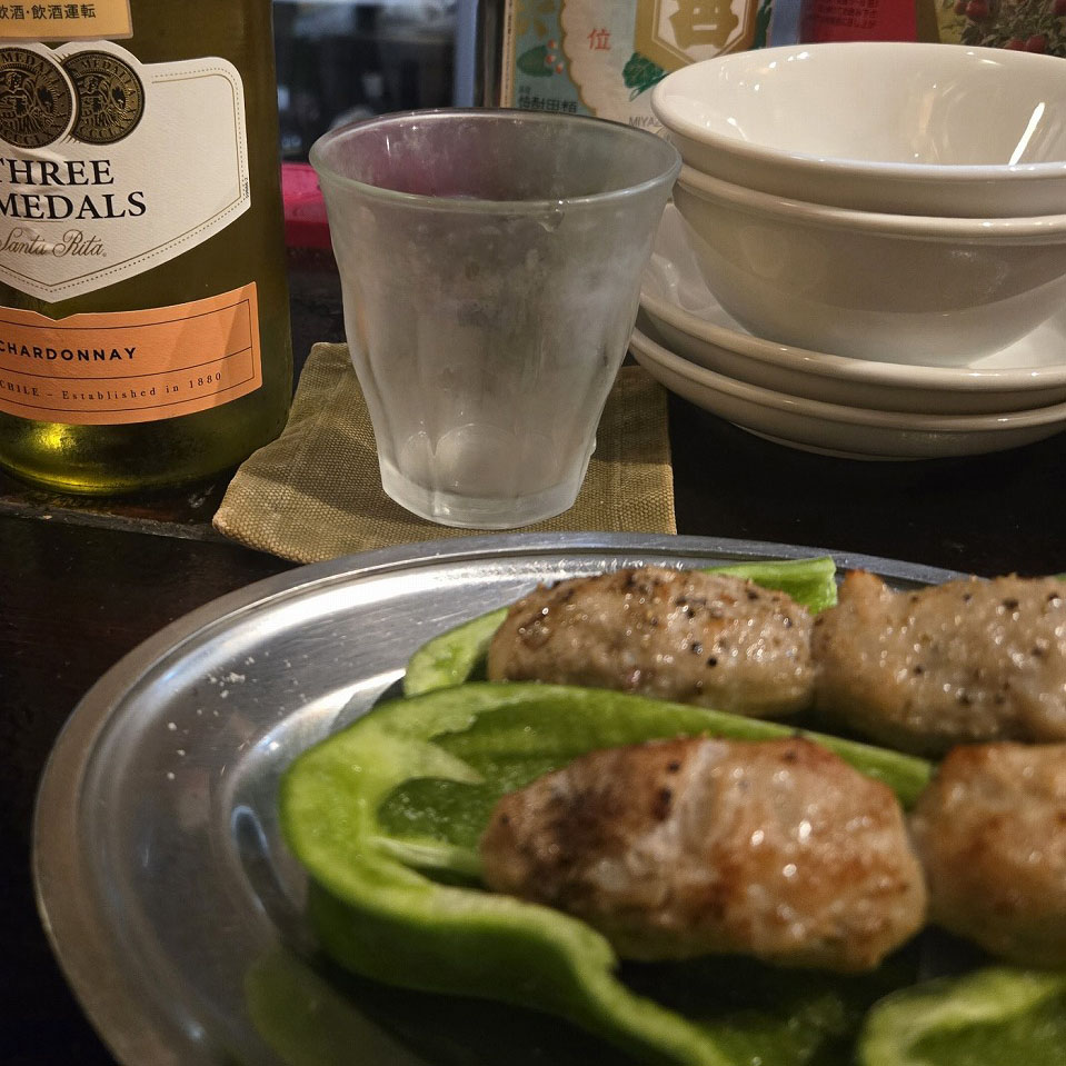 この日は冷麺を締めに持っていく構成で、まずはメニューのおすすめマークが付いた料理を中心に注文。「チーズオオバベーコン」「つくP」「ラムパクチー」など、気になるものを6品ほどオーダーしましたが、どれも本当においしい。気づけばワインが1本空いていました(笑)